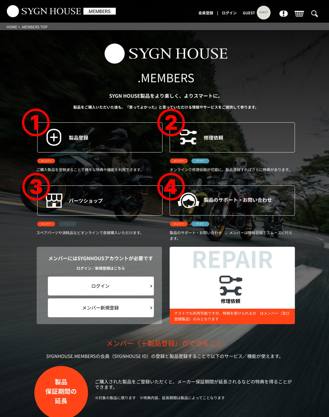 本サービスでは、製品登録、修理依頼、パーツショップ、製品のサポート・お問い合わせの4つのコンテンツを提供します。